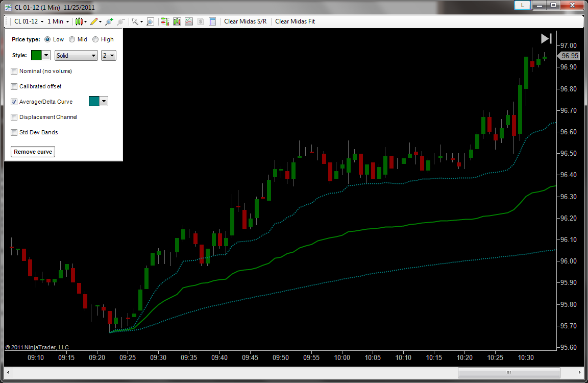 - Displacement Channels - a valuable approach, especially for sideways markets, where MIDAS channel lines are projected above and below the standard curve. With Midas Advanced, channels are launched with a checkbox and moved to fit using a slider.